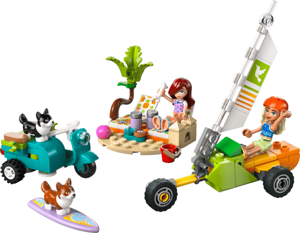 - 2 LEGO® vehicles – The set comes with a buildable scooter and buildable land yacht, each with space for a minidoll and a dog figure, plus a mini surfboard accessory for the corgis to ride