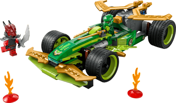 The pretend play building kit comes with 2 NINJAGO minifigures: Lloyd with 2 golden katana sword accessories, and a villainous Dragonian Warrior with a sword accessory for kids to role-play exciting battles. The building set also includes 2 lighting elements to create a small obstacle course for the race car.
