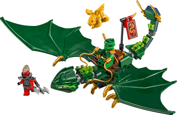 - Posable NINJAGO® dragon – A buildable model of Lloyd’s Green Forest Dragon with a posable tail, neck, legs, hands and large wings, plus a saddle so a minifigure character can ride on its back